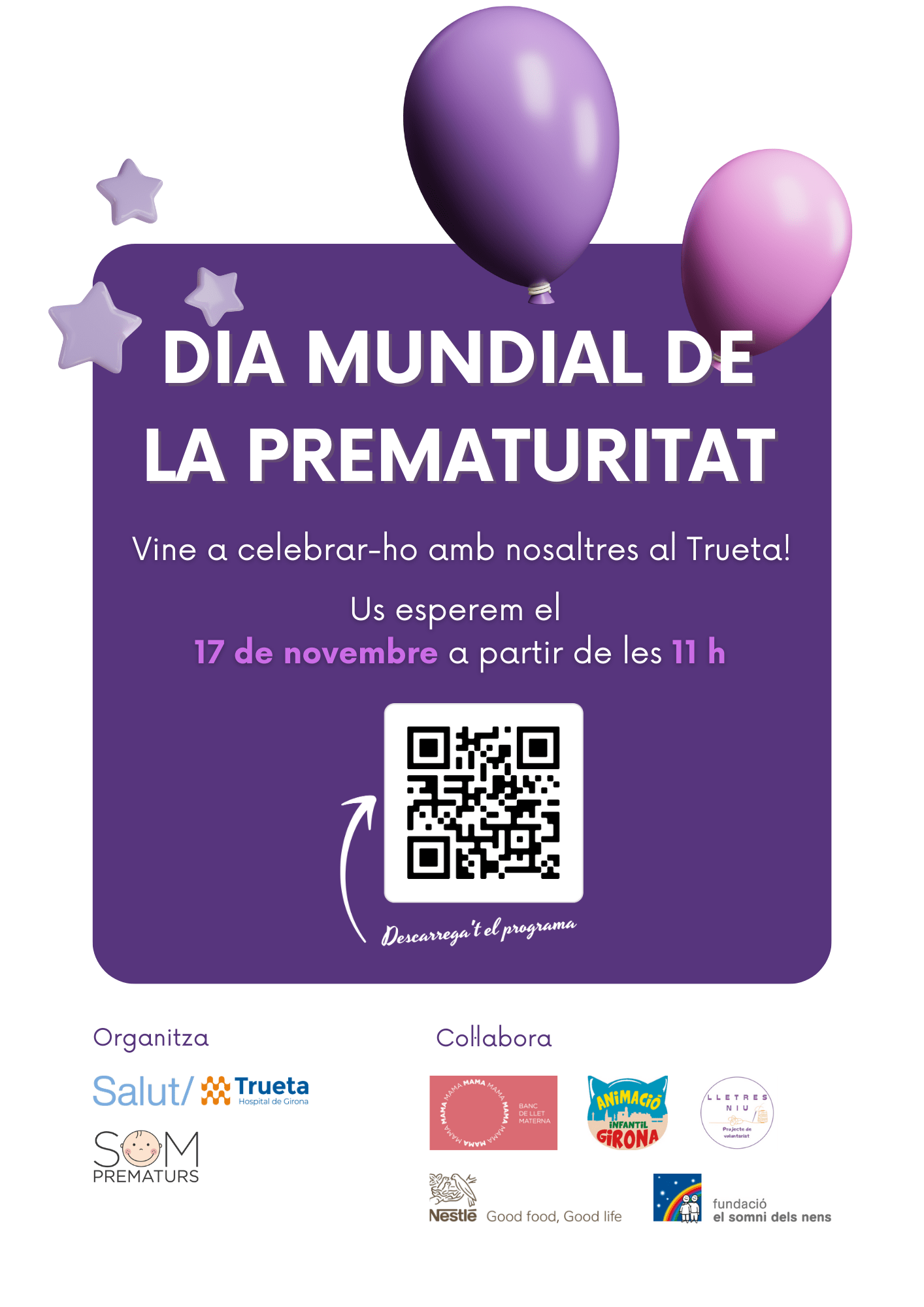 El pròxim 17 de novembre se celebra el Dia Mundial de la Prematuritat. Amb l'objectiu de commemorar aquesta data, l'Hospital Trueta i l'Associació Som Prematurs de Girona han organitzat una varietat d'activitats que inclouen tertúlies, taules informatives, música, animació i molt més. Us convidem a unir-vos a nosaltres a partir de les 11 h per compartir aquesta celebració. Serà una jornada lúdica destinada a fomentar la consciència sobre la importància de donar suport als nadons prematurs i les seves famílies. Us hi esperem!