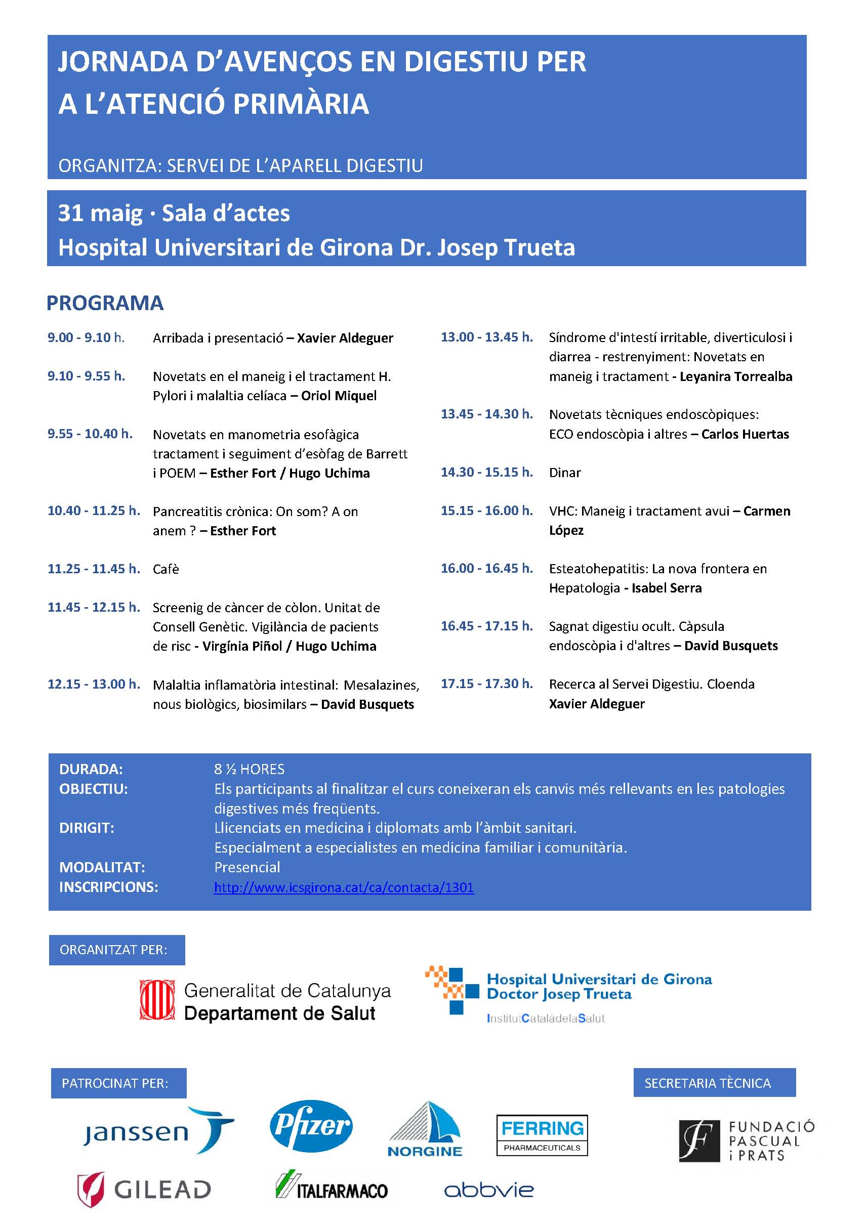 Presentem el 1er curs d'avenços en Digestiu organitzat pel Servei de l'Aparell Digestiu de l'Hospital Universitari de Girona Doctor Josep Trueta dirgit a metges no especialistes de Digestiu, sobretot per a metges de Medicina Familiar i Comunitària, i que tindrà lloc el proper 31 de maig a la sala d'actes de l'Hospital.