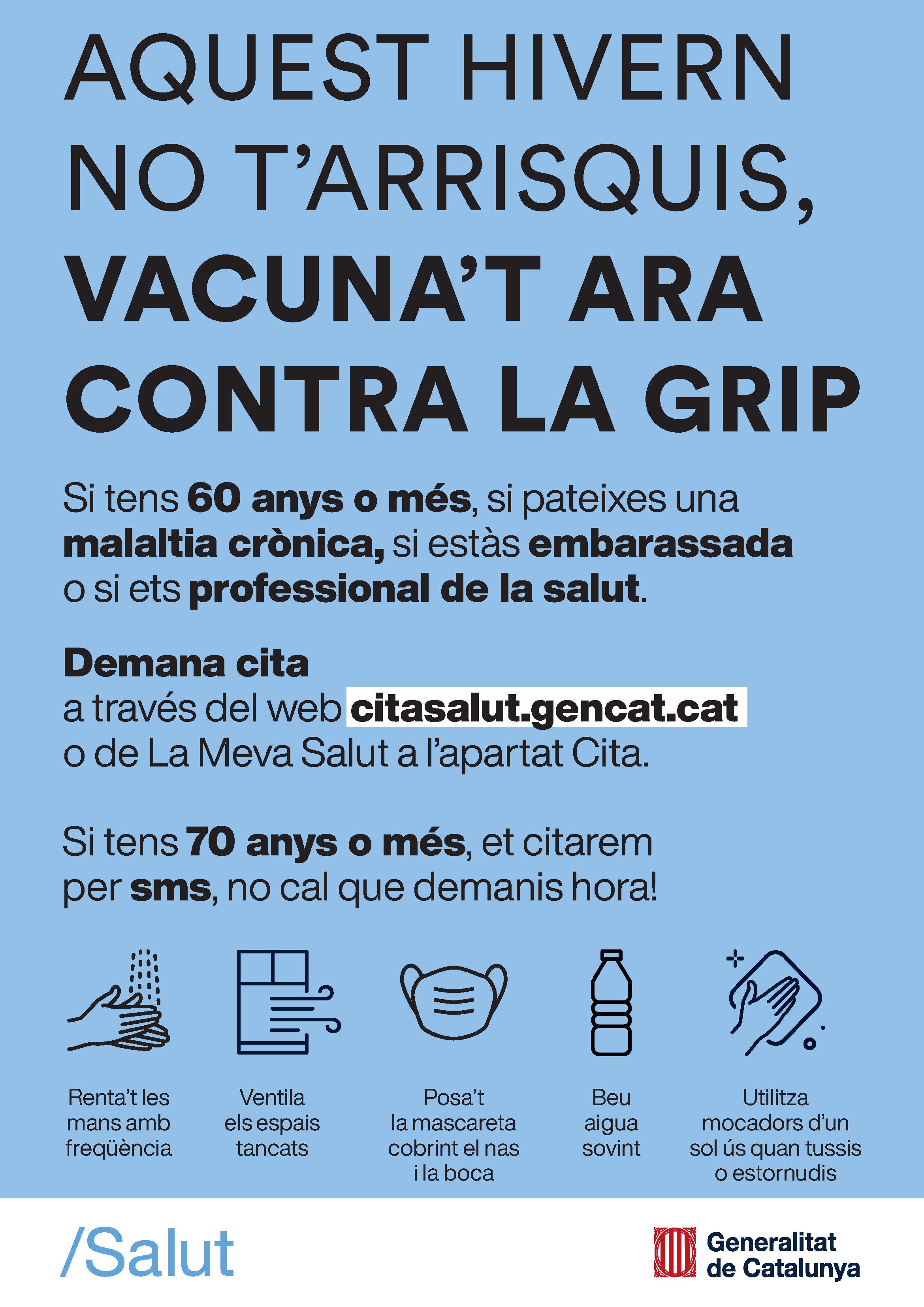 L'objectiu de la vacuna de la grip és protegir les persones més vulnerables i disminuir al màxim la possible incidència del virus en els grups de risc. Si formeu part del col·lectiu de risc, podeu demanar cita prèvia a través del web citasalut.gencat.cat o de La Meva Salut a l’apartat Cita.