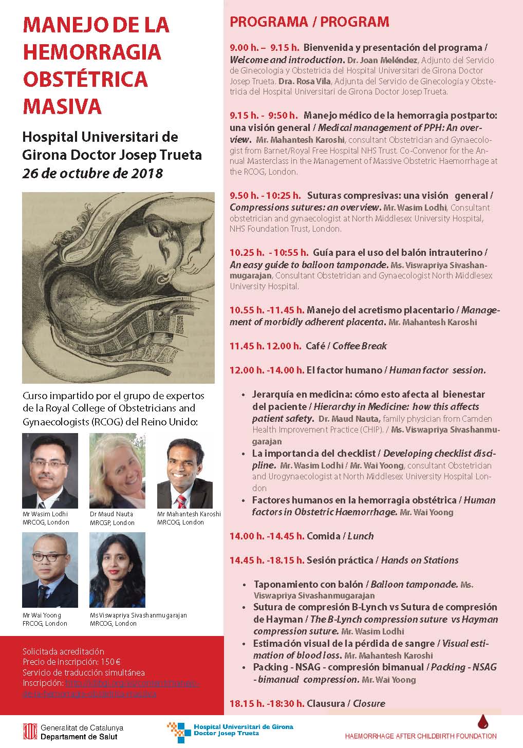 Curs "Manejo de la hemorragia obstétrica masiva", organitzat pel servei de Ginecologia i Obstetrícia i que tindrà lloc el proper 26 d'octubre de 2018 a la sala d'actes de l'Hospital Dr. Josep Trueta. La jornada comptarà amb la participació del grup d'experts de la Royal College of Obstetricians and Gynecologists (RCOG) del Regne Unit.