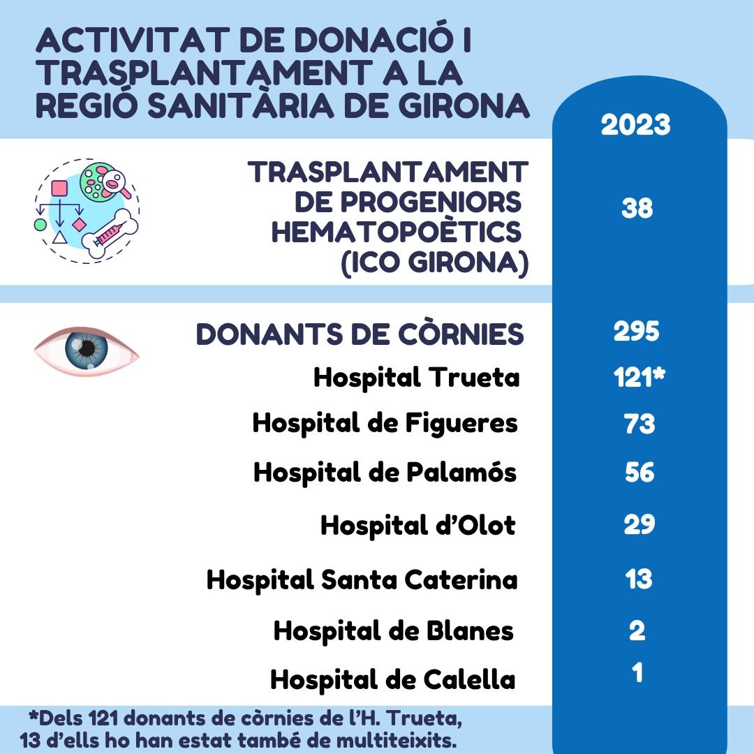 Uns 14.387 pacients s’han beneficiat, l’any 2023, dels teixits distribuïts pel Banc de Sang i Teixits (BST) de Catalunya, obtinguts prèviament gràcies a la donació cadavèrica. El BST va gestionar l’any passat 1.878 donants de Catalunya (7,4% més respecte del 2022), dels quals es van aconseguir 2.718 teixits, un 2,0% més. En total, es van obtenir 1.844 còrnies, 303 peces de teixit cardiovascular, van haver 303 donants de teixit musculoesquelètic i 268 de pell. Els hospitals de la Regió Sanitària de Girona han aconseguit 295 donants de còrnies, durant el 2023, 121 dels quals va ser al Trueta. D'aquests, 13 també ho van ser de multiteixits.