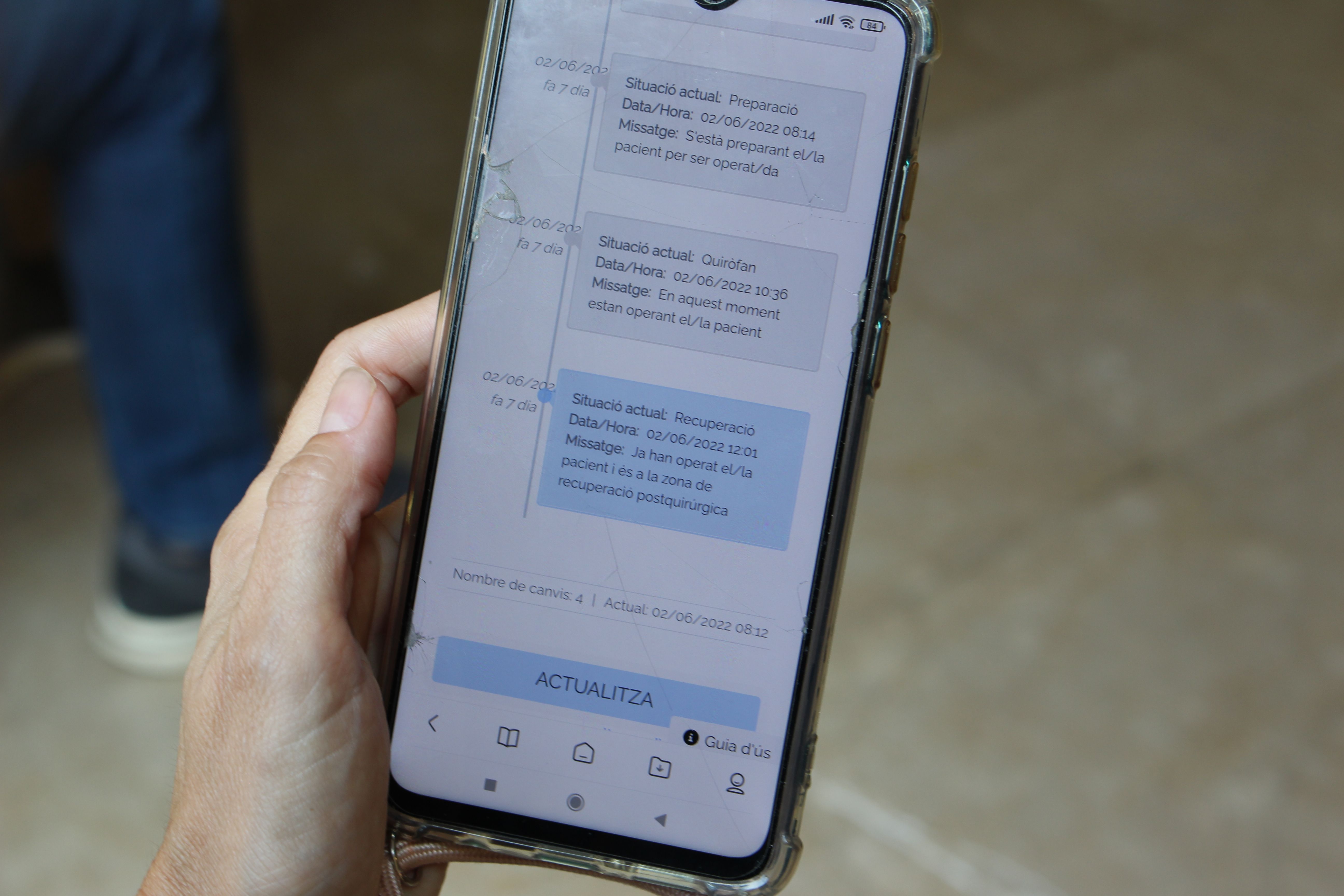 Paral·lelament, als seus familiars se’ls lliura un full informatiu que d’una banda informa del codi amb el qual s’identificarà el pacient, i de l’altra, les instruccions per poder fer el seguiment del procés quirúrgic. Els familiars podran fer el seguiment a través de dispositius mòbils des de qualsevol lloc o des la mateixa sala s’espera de l’àrea quirúrgica a través de pantalles informatives que il·lustren la situació dels pacients amb el codi que els identifica per preservar la confidencialitat. Per tal de fer el seguiment des de dispositius mòbils, els familiars hauran d’escanejar un codi QR que també els facilitaran i que els enllaçarà a una web, a la qual només hauran d’introduir el codi identificador del seu familiar. A partir d’aquell moment, ja podran fer el seguiment en línia de manera que no cal que estiguin físicament a l’hospital.