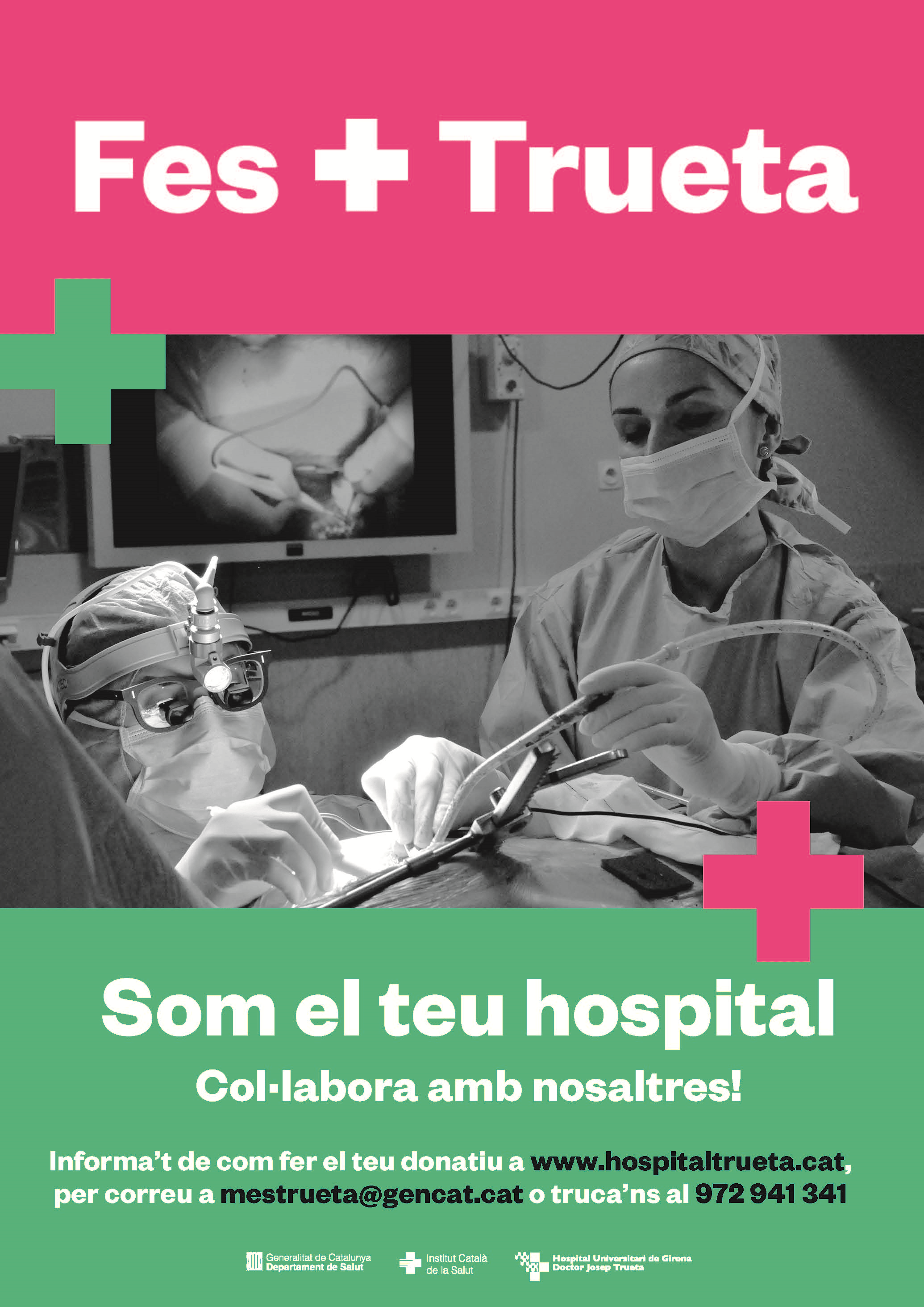 Amb el lema “Fes + Trueta”, l’Hospital Universitari de Girona Doctor Josep Trueta engega una nova campanya de mecenatge que vol facilitar les donacions solidàries de la ciutadania i promoure-les. Es tracta d’una iniciativa que neix amb la finalitat d’implicar entitats, empreses i particulars en el projecte assistencial del centre, sensibilitzar la societat civil de la importància de les seves aportacions altruistes, i obtenir recursos complementaris a les aportacions públiques per millorar encara més la qualitat de l’assistència que s’ofereix als pacients.