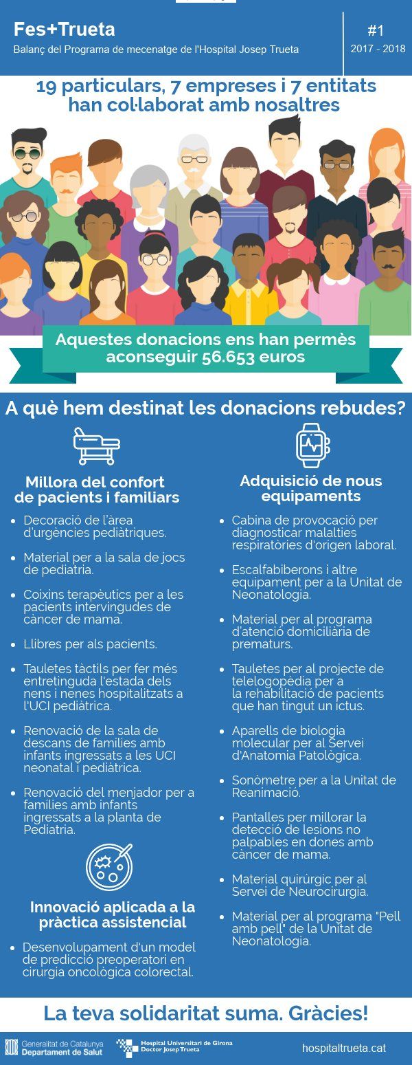 Vols saber a què hem destinat les donacions que hem rebut per a la campanya Fes + Trueta? Gràcies a les donacions de 19 particulars, 7 empreses i 7 entitats, que ens han permès aconseguir 56.653€, hem aconseguit millorar el confort de pacients i familiars i adquirir nous equipaments. Fes + Trueta', té com a objectiu implicar entitats, empreses i particulars en el projecte assistencial del centre, sensibilitzar la ciutadania sobre la importància de les aportacions altruistes i aconseguir recursos complementaris per millorar el servei.