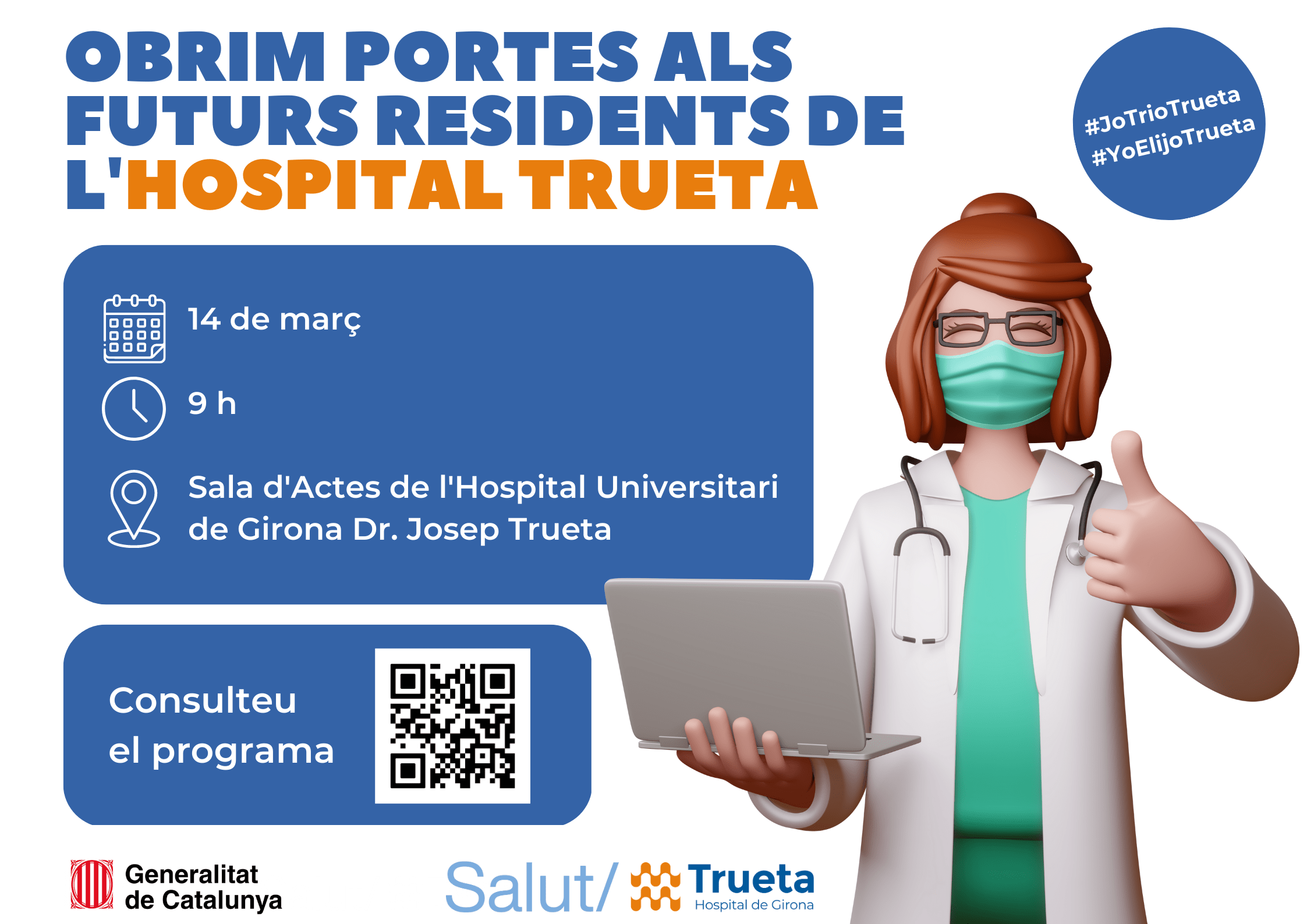El proper 14 de març, la sala d'actes de l'Hospital Dr. Josep Trueta acollirà la Jornada de Portes Obertes perquè els futurs residents coneguin els avantatges de fer la seva formació sanitària especialitzada al nostre centre. La jornada va dirigida tant a residents d'infermeria com de medicina, que estiguin interessats en especialitzar-se al Trueta.