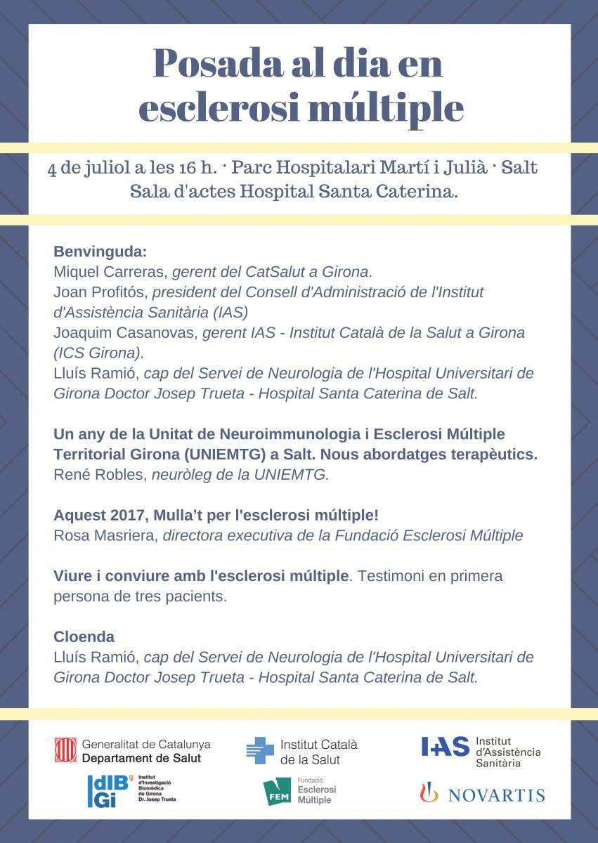 La Unitat de Neuroimmunologia i Esclerosi Múltiple (UNIEM) de l’Hospital Universitari Dr. Josep Trueta de Girona organitza el proper 4 de juliol la jornada "Posada al dia en esclerosi múltiple", que es durà a terme a la sala d'actes de l'Hospital Santa Caterina de Salt. En aquesta trobada, i aprofitant el primer any de treball de la UNIEM al Parc Hospitalari Martí i Julià, es repassarà l’activitat realitzada per l’equip interdisciplinari de la Unitat i s'informarà de les novetats terapèutiques ocorregudes durant el darrer any.