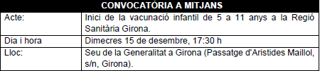 Els mitjans interessats en prendre imatges de l’inici de la vacunació infantil, podran fer-ho demà a les 17:30h a l’edifici de la Generalitat a Girona: