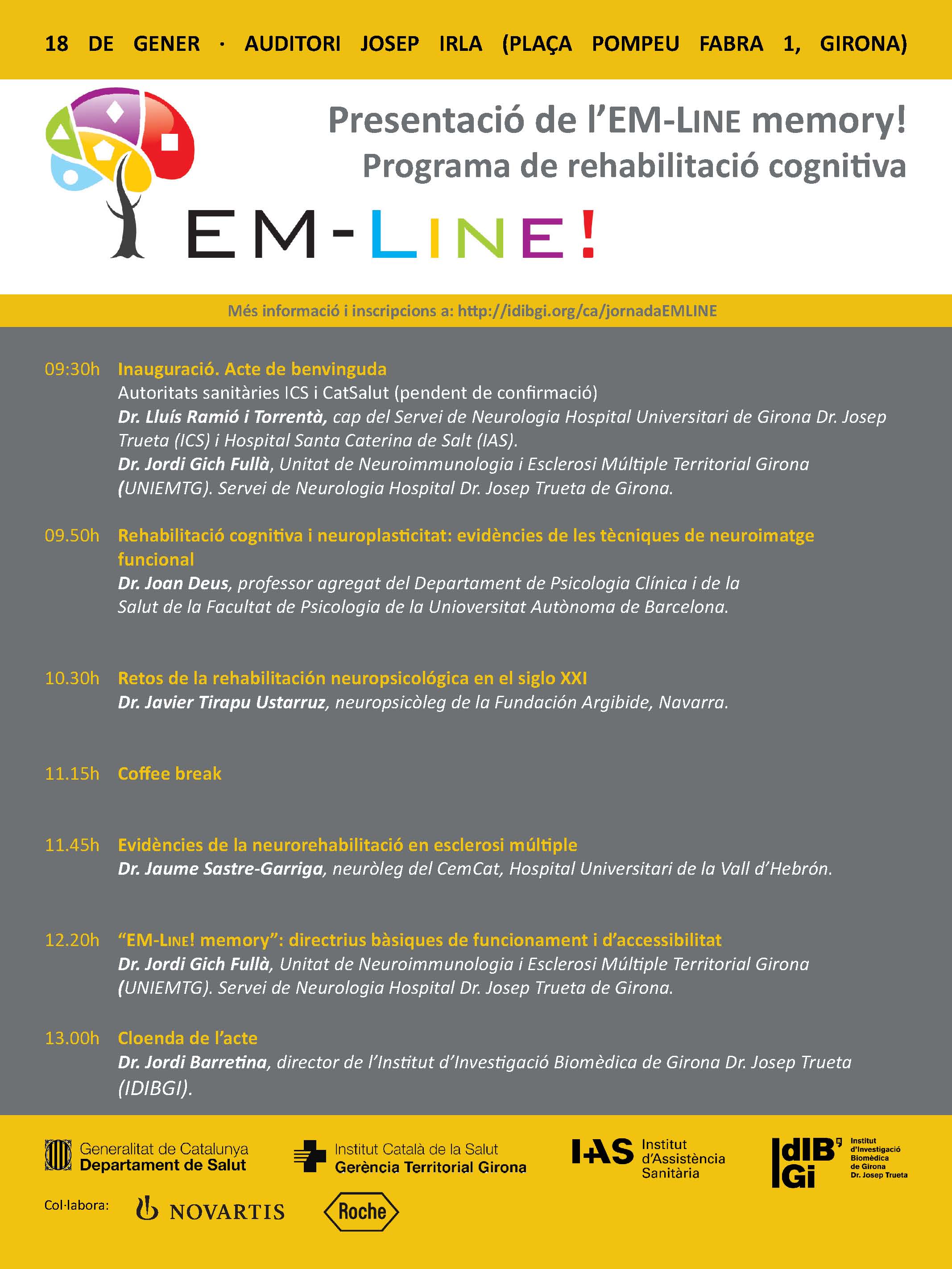 El proper 18 de gener al matí a l'Auditori Josep Irla de la Generalitat a Girona, tindrà lloc la presentació del “Projecte EM-line!”, un programa de rehabilitació cognitiva que inicialment va ser creat per a pacients afectats d’esclerosi múltiple. L’objectiu principal del “Projecte EM-line!” és proporcionar un instrument de rehabilitació cognitiva perquè els pacients ho puguin utilitzar des de casa seva, sense necessitat que el tractament interfereixi en les seves activitats habituals, amb implicació dels familiars i sense cost econòmic.