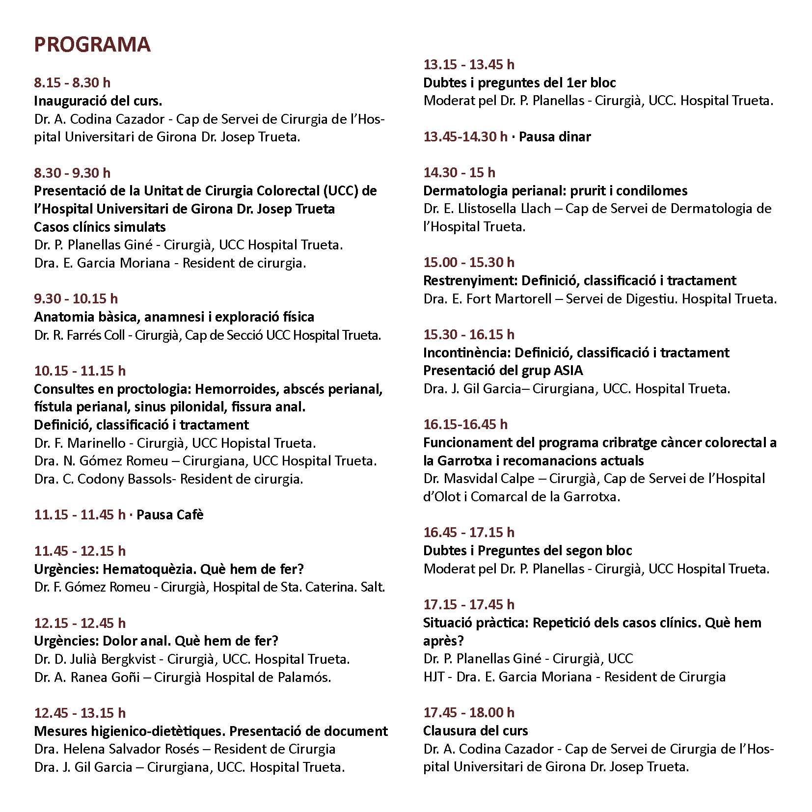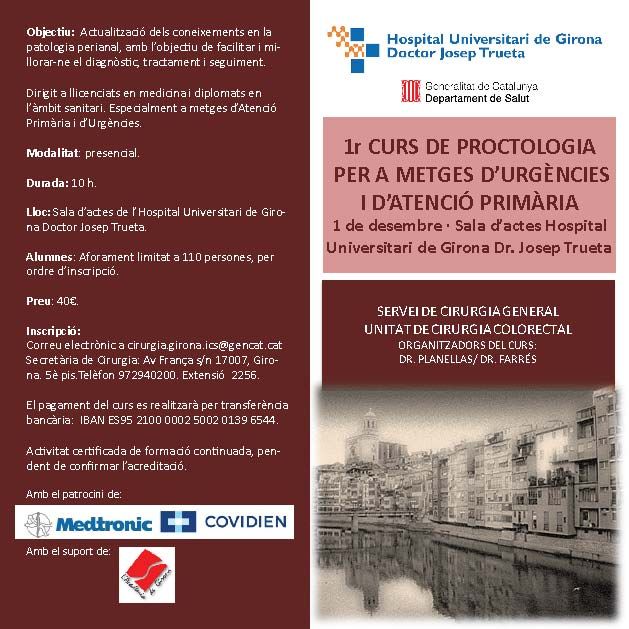 El proper 1 de desembre tindrà lloc el primer curs de proctologia dirigit professionals sanitaris, especialment a metges d'urgències i d'atenció familiar i comunitària, a la sala d'actes de l'Hospital universitari de Girona Dr. Josep Trueta. El curs està organitzat per la Unitat de Cirurgia Colorectal del Servei de Cirurgia General i Digestiva de l'Hospital Trueta. L'objectiu és l'actualització dels coneixements en la patologia perianal, amb l'objectiu de facilitar i millorar-ne el diagnòstic, tractament i seguiment. Dirigit a llicenciats en medicina i diplomats en l'àmbit sanitari, especialment metges d'atenció primària i urgències. Descarregueu-vos el programa en pdf.