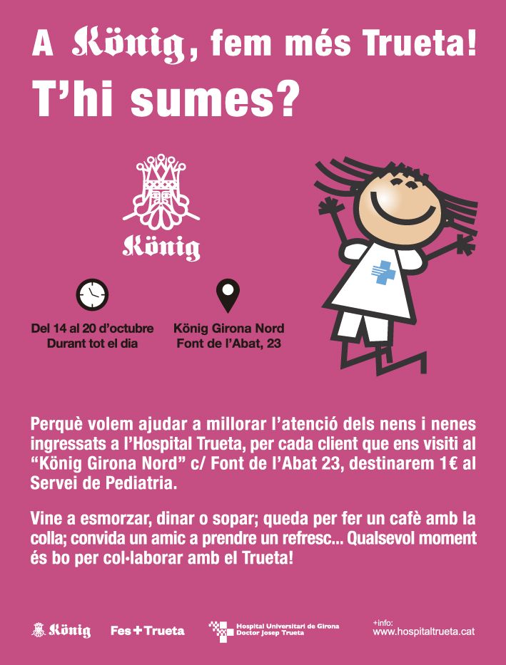 L’acció solidària de König âque tindrà lloc des del dilluns 14 d’octubre fins al diumenge 20 d’octubre, ambdós inclosos, en horari de 9 del matí a 12 de la nitâ vol animar tothom a acostar-se al local de Girona Nord per esmorzar, dinar, sopar, prendre un cafè o un refresc i ajudar així a fer un Hospital Trueta encara millor per als més petits.