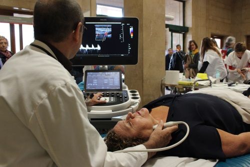 Imatges dels actes dels professionals del servei de Neurologia realitzant ecografies de doppler i donant consells de salut, avui al vestíbul del Trueta.