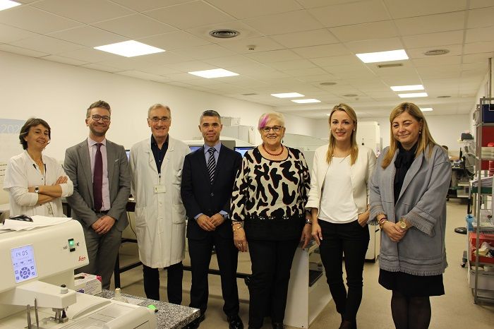 Avui s’ha dut a terme l’acte d’entrega de la màquina a l’Hospital Trueta amb la presència de Glòria Padura, directora de l’Hospital Josep Trueta; Eugeni López Bonet, cap del Servei d’Anatomia Patològica; Lluïsa Ferrer, presidenta de l’Oncolliga; Lídia Blade, directora de l’àrea de negoci de CaixaBank al Pla de l’Estany; David Vilanova, director d’àrea de negoci de CaixaBank a Girona, i Ivan Tibau, director de banca d’Institucions de CaixaBank a Girona.