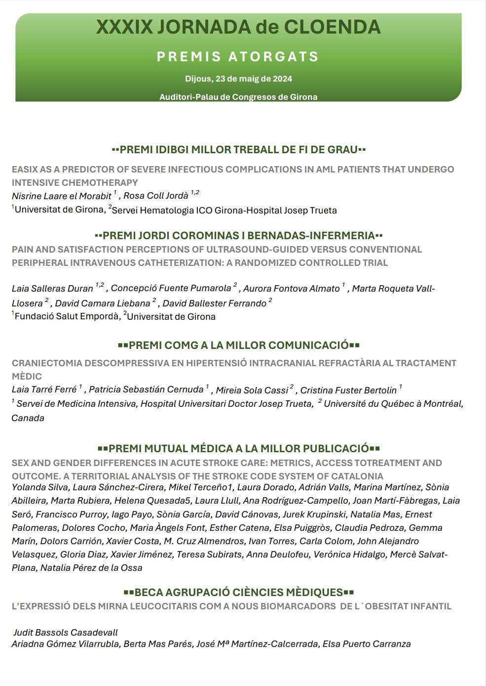 La Sociedad Espanyola de Diabetis ha guardonat amb el Primer Premi de Projectes d’Implementació i Avaluació en Gestió Assistencial de la Diabetis el projecte, liderat per la Unitat de Diabetis, Endocrinologia i Nutrició (UDEN) de l’Hospital Universitari de Girona Dr. Josep Trueta, titulat: "Procés assistencial diabetis mellitus 1 (DM1) vinculat a la història clínica electrònica. Una experiència col·laborativa d’obtenció de dades estructurades a temps real dels serveis d’endocrinologia dels hospitals de referència de l’Institut Català de la Salut". El lliurament del Premi es va fer divendres 29 d’abril a Las Palmas de Gran Canaria, en el marc del XXXIII Congrés de la Societat Espanyola de Diabetis.
