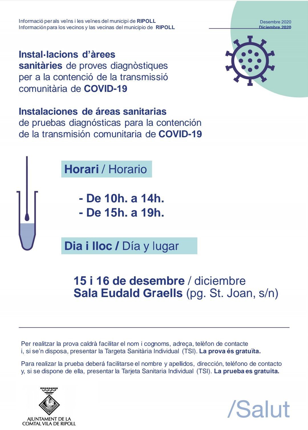 Les proves amb testos antigènics ràpids (TAR) a Ripoll es faran el dimarts 15 i el dimecres 16 de desembre, en l’horari i espai següents: