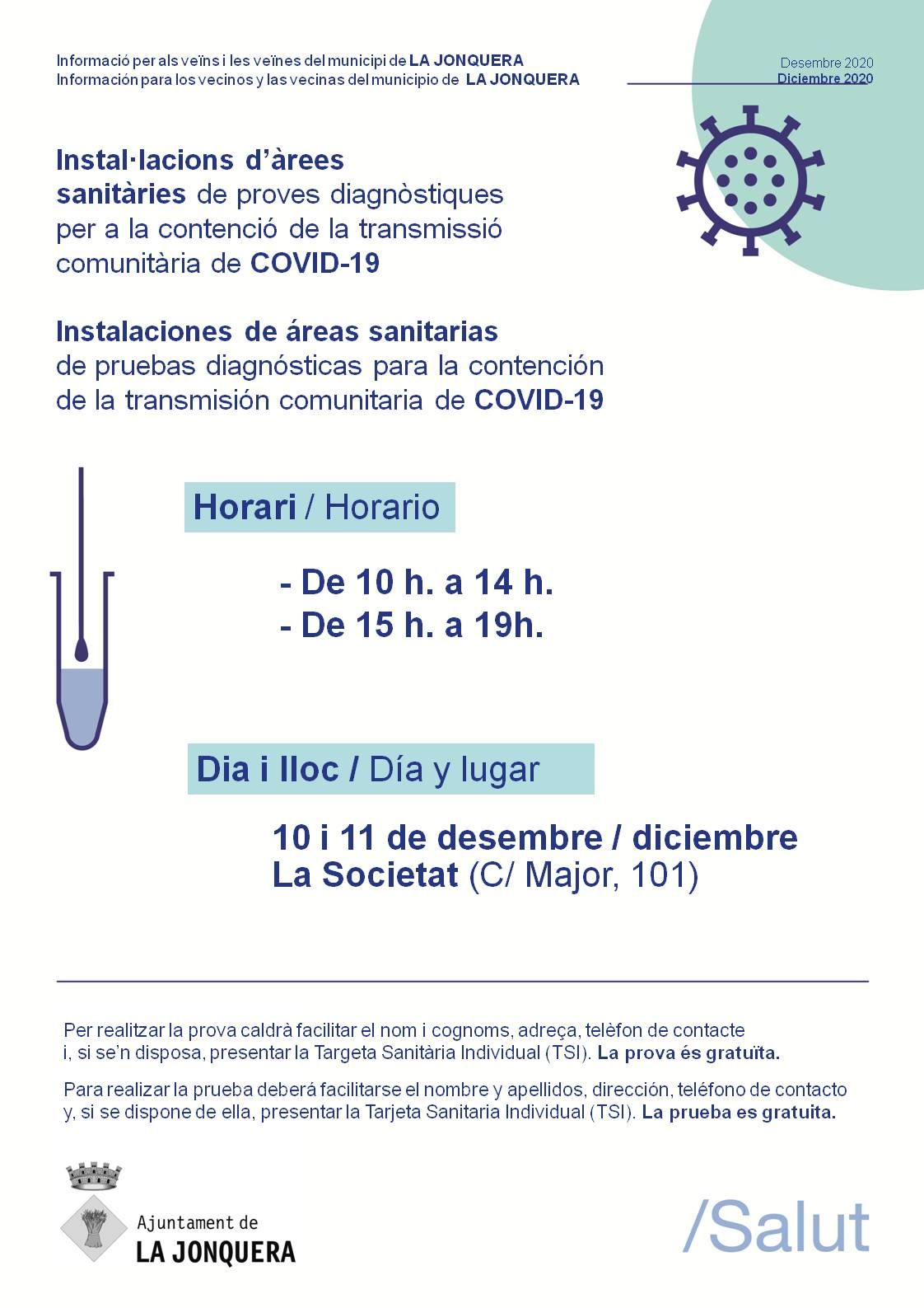Les proves amb testos antigènics ràpids (TAR) es faran en dos dies, el dijous 10 i el divendres 11 de desembre, en l’horari i espai següents: