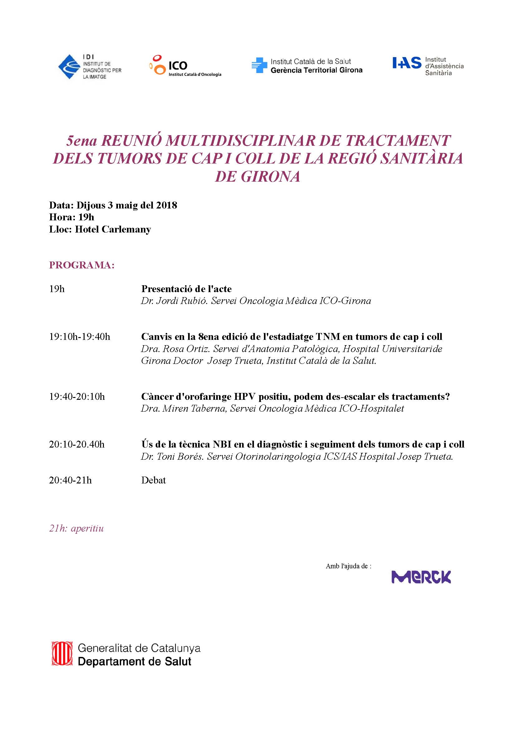 El proper 3 de maig a les 19h es realitzarà a l'Hotel Carlemany la "5ª reunió multidisciplinar de tractament de tumors de cap i coll de la Regió Sanitària de Girona", promoguda per la Unitat Funcional de Tumors de Cap i Coll de l'Hospital Dr. Josep Trueta/ ICO Girona i oberta a tots els especialistes de la patologia. La jornada estarà centrada en l'actualització de l'estadiatge i tractament d'aquest tipus de tumors.