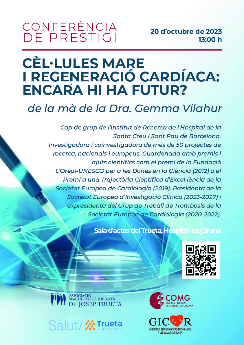 L’Associació de Facultatius Jubilats Dr. Josep Trueta, el Col·legi Oficial de Metges de Girona, l'Associació GICOR i l'Hospital Universitari de Girona Dr. Josep Trueta us convidem a la conferència de prestigi titulada "Cèl·lules mare i regeneració cardíaca: encara hi ha futur?" que es realitzarà el pròxim 20 d'octubre a les 13 h. L'esdeveniment tindrà lloc a la sala d'actes de l'Hospital Dr. Josep Trueta. Aquesta ponència serà impartida per la Dra. Gemma Vilahur. La Dra. Vilahur exerceix com a cap de grup de l'Institut de Recerca de l'Hospital la Santa Creu i Sant Pau de Barcelona.