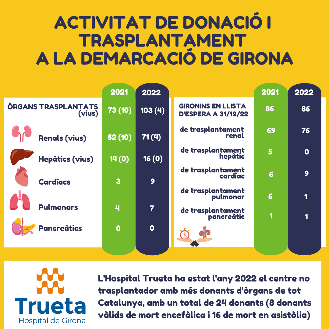 Un total de 103 gironins han rebut un trasplantament aquest any 2022, 30 més que l’any anterior, mentre que 86 gironins estaven en llista d’espera a finals d’any.