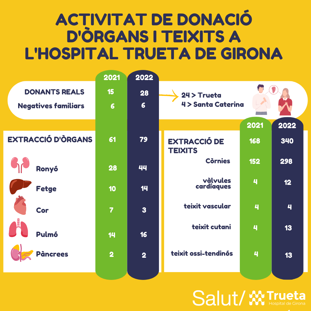 A la demarcació de Girona destaca el fet que hi ha hagut 28 donants d’òrgans, 24 dels quals a l’Hospital Universitari de Girona Dr. Josep Trueta i 4 a l’Hospital Santa Caterina. Un any més, el Trueta ha estat el centre no trasplantador amb més donants d’òrgans de tot Catalunya (8 donants vàlids de mort encefàlica i 16 de mort en asistòlia). Al Trueta s’han extret aquest any 79 òrgans i s’han extret fins a 340 teixits, principalment còrnies -298-. El creixement de l’activitat en relació al 2021 ha estat important, ja que aquell any es van extreure 61 òrgans i 168 teixits.