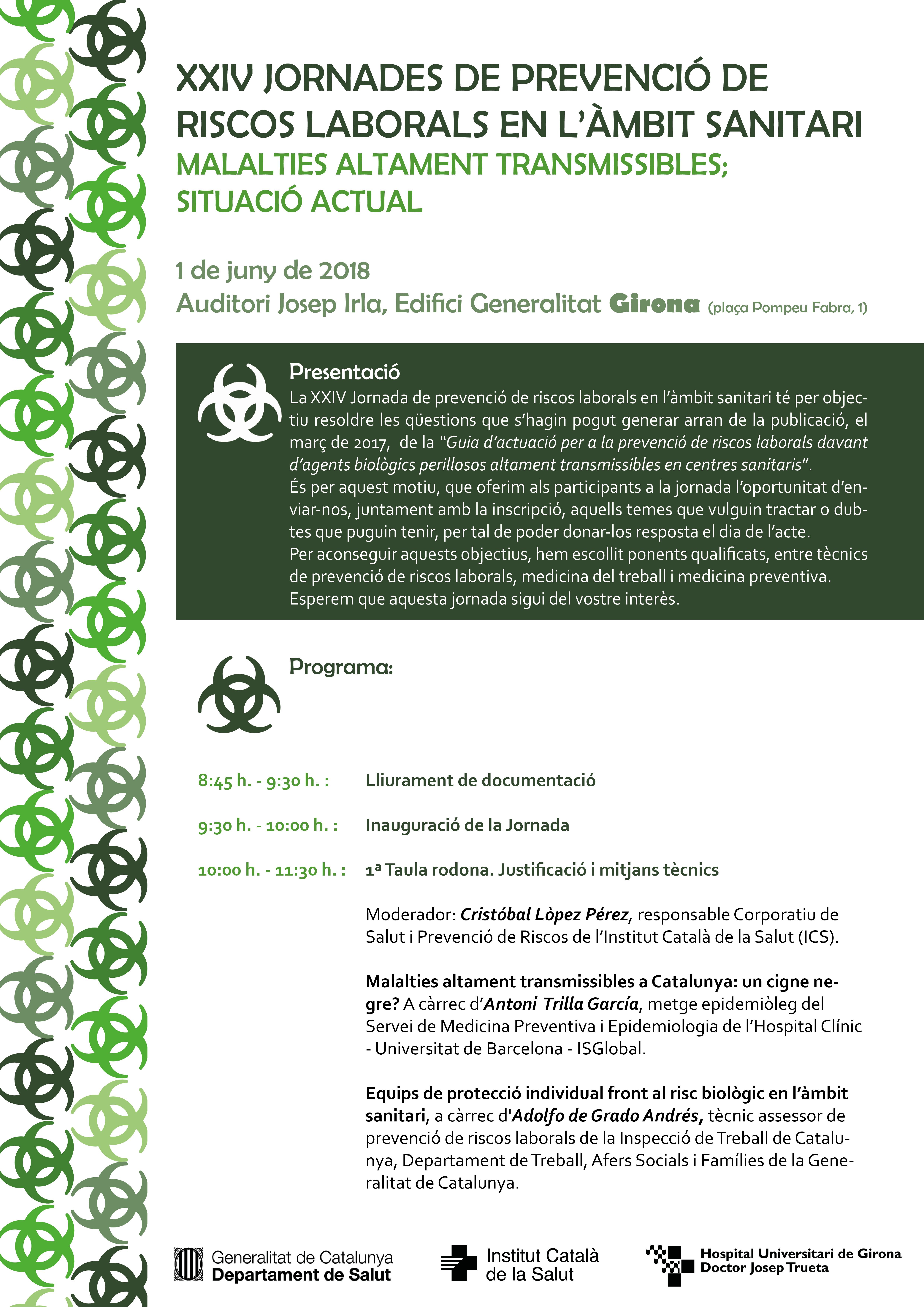 La Unitat Bàsica de Prevenció de la Gerència Territiruial Girona organitza pel proper 1 de juny la XXIV Jornada de prevenció de riscos laborals en l’àmbit sanitari. Aquesta jornada, que se celebrarà a l'Auditori Josep Irla, té per objectiu resoldre les qüestions que s’hagin pogut generar arran de la publicació, el març de 2017, de la “Guia d’actuació per a la prevenció de riscos laborals davant d’agents biològics perillosos altament transmissibles en centres sanitaris”.