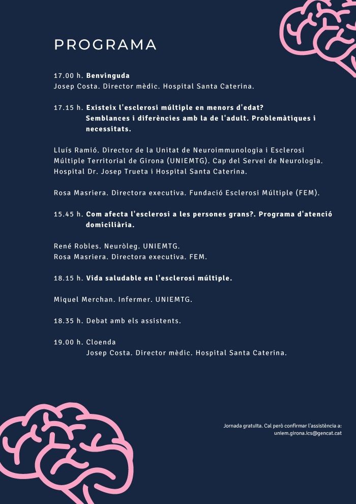 La Unitat de Neuroimmunologia i Esclerosi Múltiple Territorial de Girona organitza la tercera edició de la jornada "Posa't al dia en Esclerosi Múltiple", que tindrà lloc el proper 3 de juliol a la sala d’actes de l’Hospital de Santa Caterina de Salt. La jornada tractarà l’esclerosi múltiple en els menors d’edat, de com afecta aquesta malaltia a les persones grans, i de com els pacients amb aquesta malaltia poden portar una vida saludable.