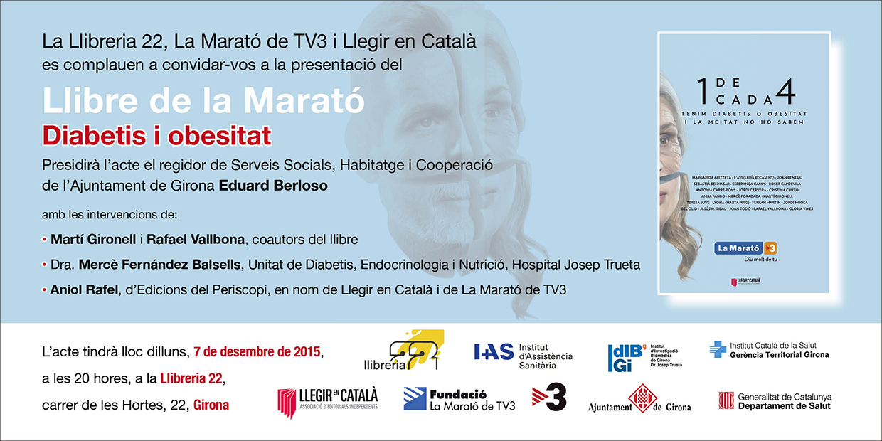 La Llibreria 22 acollirà el proper dilluns 7 de desembre a les 20 h la presentació del llibre de La Marató de TV3 d’enguany: Diabetis i Obesitat.