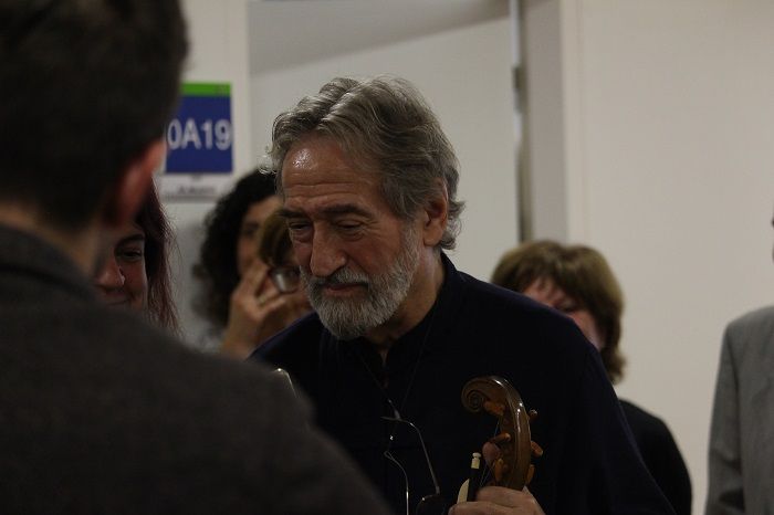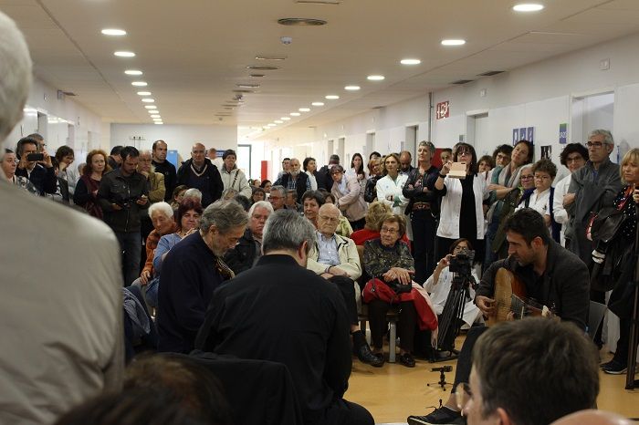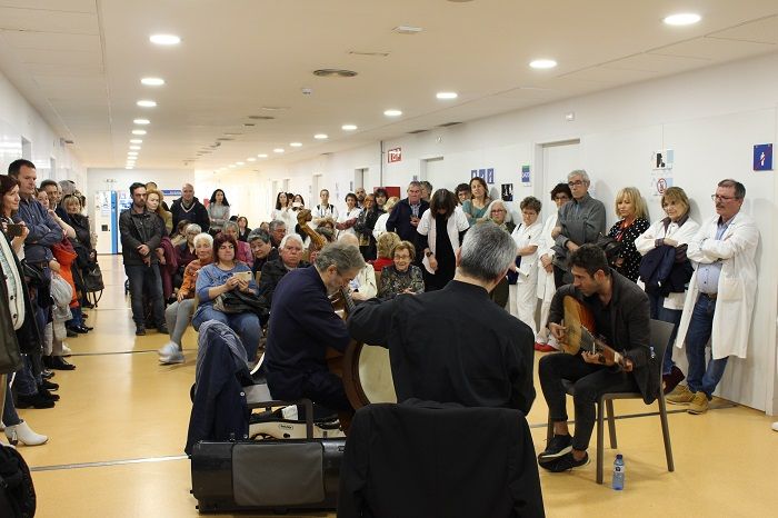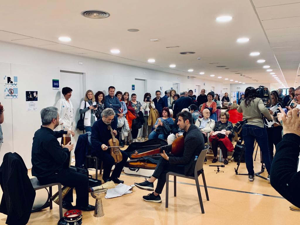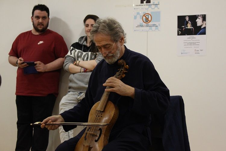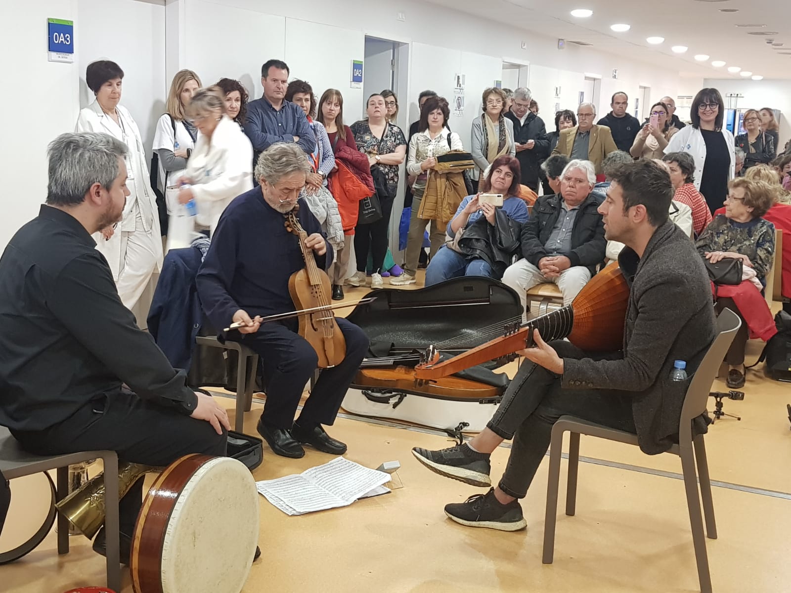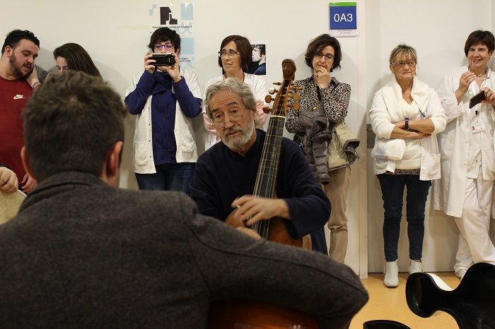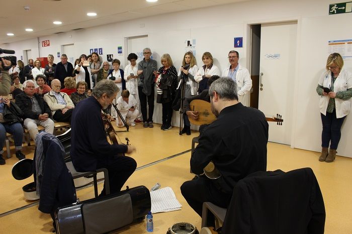 La sala d'espera de l'edifici de consultes externes de l’Hospital Universitari de Girona Dr. Josep Trueta ha estat l’escenari, avui dimecres 24 d’abril, del primer concerts del mestre Jordi Savall dins el cicle que oferirà a diversos centres hospitalaris i sociosanitaris de la demarcació de Girona durant els anys 2019 i 2020 i, a més, a la presó de Figueres, on ha actuat avui també. Els músics participants han estat el mestre Jordi Savall, el seu fill Ferran Savall i el percussionista David Mayoral.