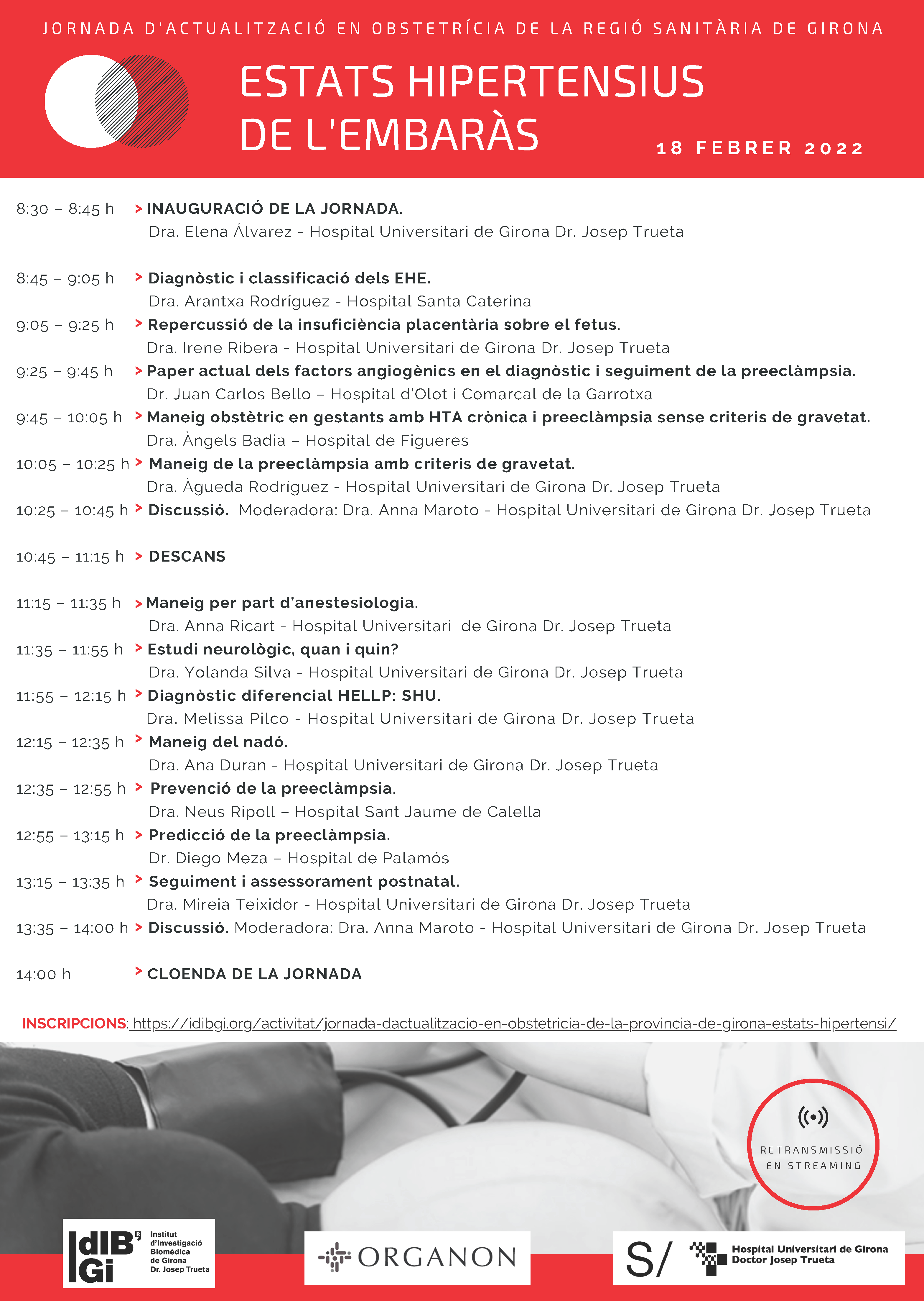 La sessió compta amb la participació de professionals de diferents especialitats de l’Hospital Universitari Dr Josep Trueta de Girona i professionals d’altres centres de la Regió Sanitària de Girona. L’objectiu serà tractar de forma global i multidisciplinar l’abordatge dels estats hipertensius durant l’embaràs, postpart i preconcepcional.