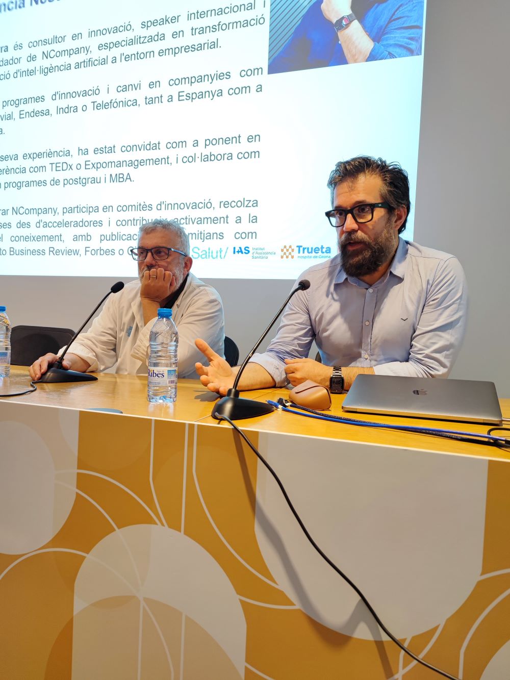 La Unitat d’Innovació de l’Hospital Trueta i l’Institut d’Assistència Sanitària (IAS) va organitzar ahir dijous la ponència sobre intel·ligència artificial generativa a càrrec de Néstor Guerra, consultor en innovació, conferenciant internacional i expert en transformació digital. La conferència, celebrada a la sala d’actes del Trueta, va reflectir la ràpida evolució que està experimentant aquesta tecnologia i com transformarà la nostra societat en molts àmbits, tant professionals com personals. Com a mostra, Guerra va repassar diferents eines basades en la intel·ligència artificial (IA), moltes de les quals encara poc conegudes, però que van sorprendre els assistents per les capacitats que presenten.
