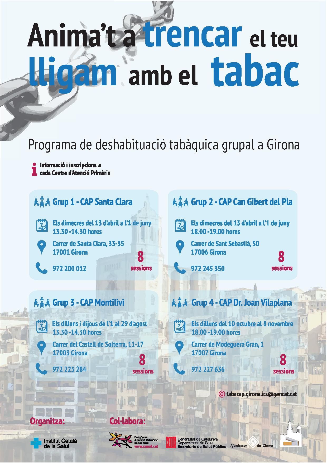 Les teràpies grupals es duran a terme des d’aquest mes d’abril fins al mes de novembre als quatre centres d’atenció primària, en dates i/o en horaris diferenciats per facilitar la participació de les persones interessades. Al CAP Santa Clara es portaran a terme els dimecres des del 13 d’abril fins a l’1 de juny, de les 13.30 a les 14.30 h. Al CAP Can Gibert del Pla es desenvoluparà en les mateixes dates, però en horari de tarda, de les 18 h a les 19 h. Al CAP Montilivi es farà una teràpia intensiva durant el mes d’agost, concretament els dilluns i dijous de l’1 al 29 d’agost, de les 13.30 a les 14.30 h. Al CAP Doctor Joan Vilaplana, de Taialà, es portarà a terme els dilluns del 10 d’octubre al 8 de novembre, de les 18 h a les 19 h. Totes les teràpies grupals constaran de vuit sessions. Les persones que es vulguin apuntar a alguna d’aquestes sessions han d’enviar un correu electrònic a tabacap.girona.ics@gencat.cat o poden demanar més informació a qualsevol dels quatre centres participants.