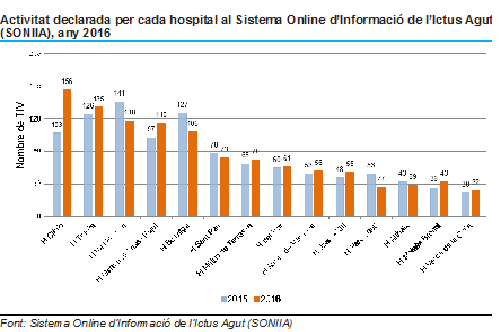 La taula següent mostra el nombre de trombòlisi intravenoses (TIV) per cada hospital d’ictus comparat amb l’any anterior. S’observa que l’Hospital Trueta, ha estat el segon hospital en nombre de casos tractat amb trombolítics.