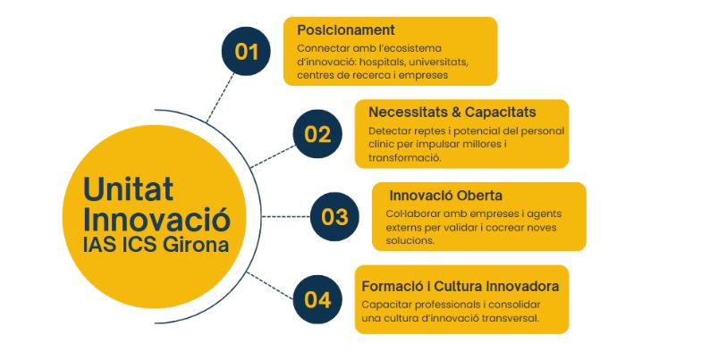 En aquest context, la Unitat d'Innovació IAS – ICS Girona té com a missió fomentar i promoure l’esperit innovador dins l’àmbit sanitari, tot donant suport personalitzat per impulsar la innovació a tots els nivells de l’organització.