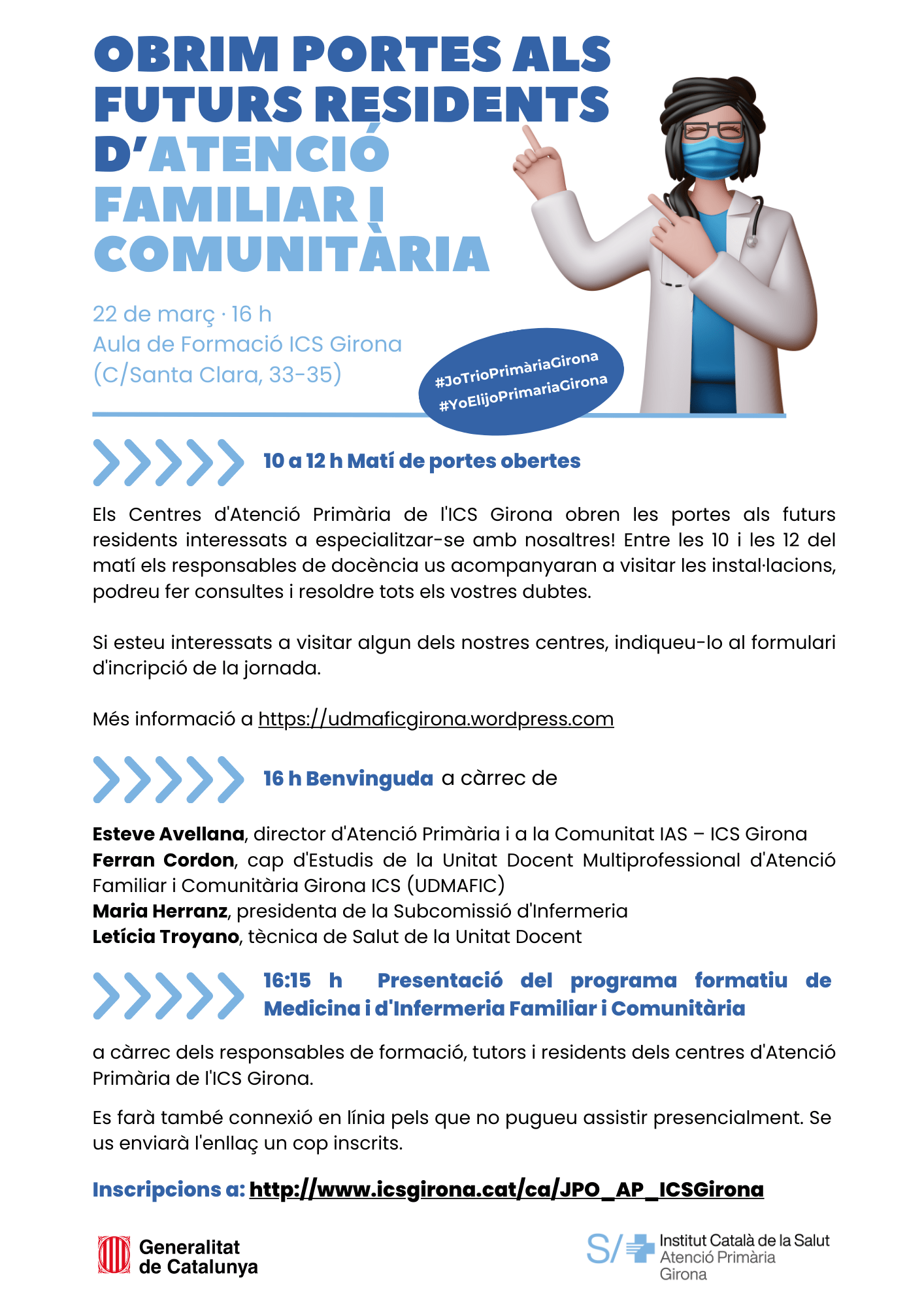 L’Institut Català de la Salut a Girona organitza el 19 i 20 de març una nova Jornada de Portes Obertes amb l’objectiu de mostrar als futurs residents de medicina, infermeria i farmàcia com són els centres i com està planificada cada especialització. Els assistents, després de rebre la benvinguda a la sala d’actes de l’Hospital Trueta (9:30 h, el 19 de març i 9:00 h, el 20), rebran la informació de cada especialitat per part de residents i tutors/ores, i podran fer una visita guiada per diferents serveis assistencials, segons les seves preferències, de manera que podran visitar aquelles especialitats per a les quals tinguin més interès. Aquesta visita guiada la faran acompanyats dels residents actuals, amb els quals tindran l’oportunitat de resoldre dubtes, conversar i intercanviar impressions. Per assistir-hi de forma presencial, cal enviar prèviament un formulari d’inscripció.