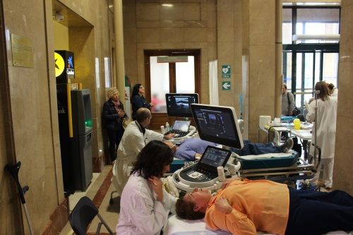 Imatges dels actes dels professionals del servei de Neurologia realitzant ecografies de doppler i donant consells de salut, avui al vestíbul del Trueta.