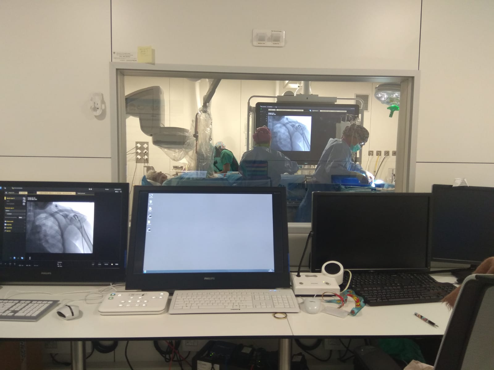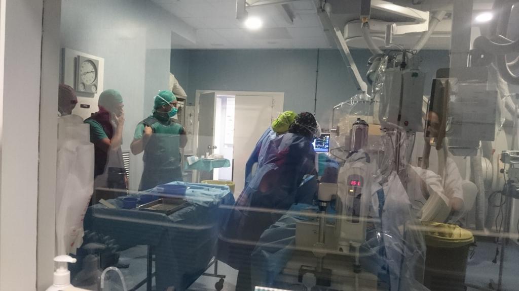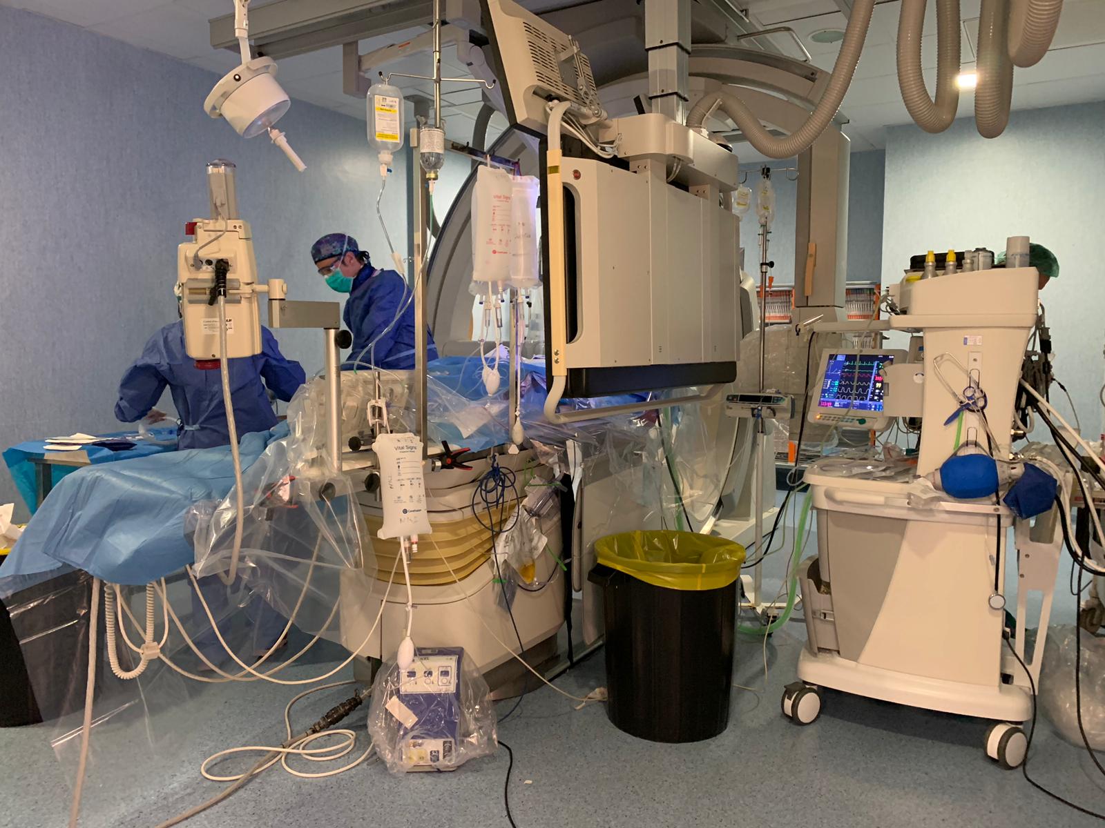La sala de radiologia intervencionista durant la realització d'una trombectomia mecànica a un pacient que havia patit un ictus isquèmic.