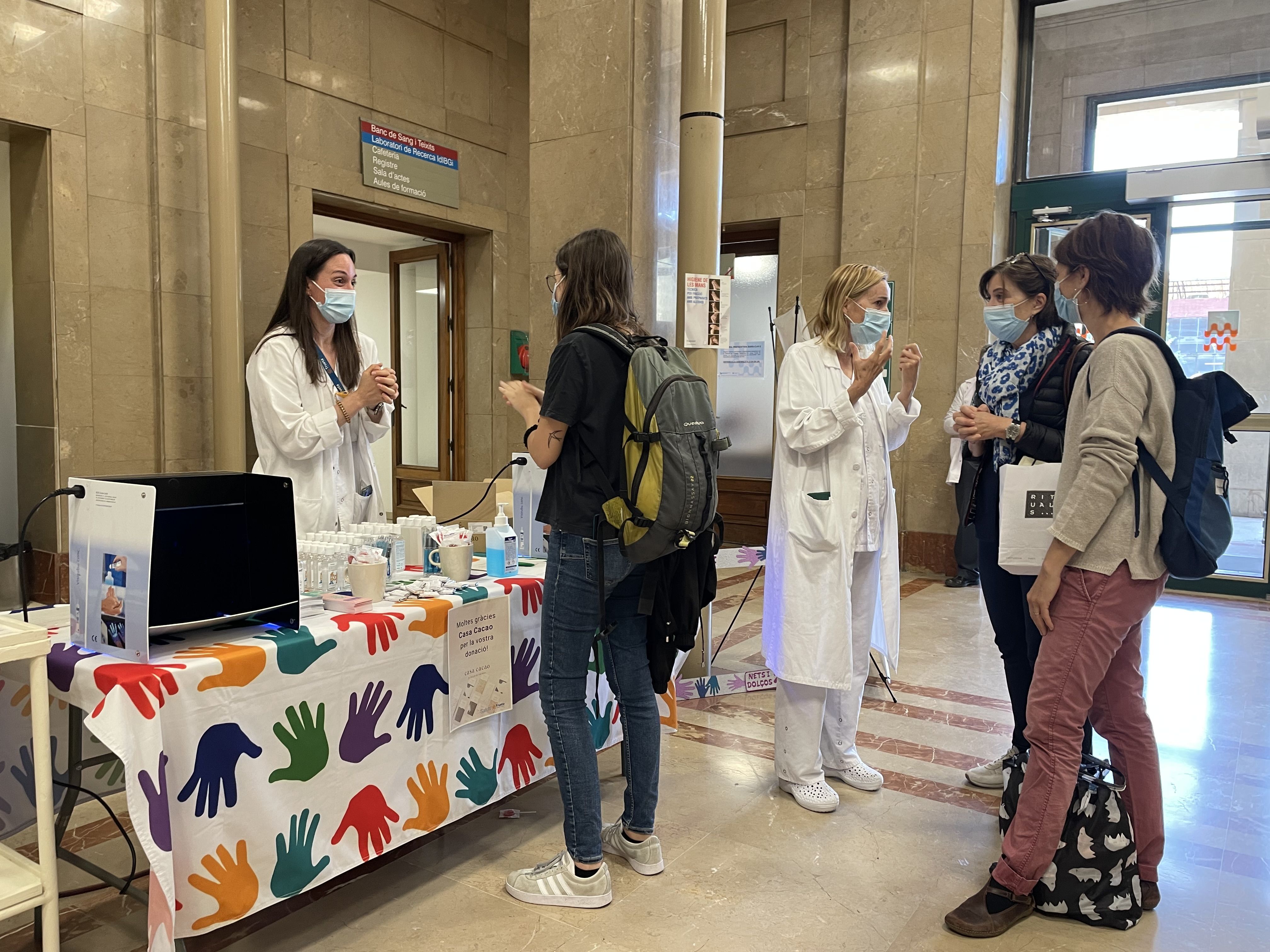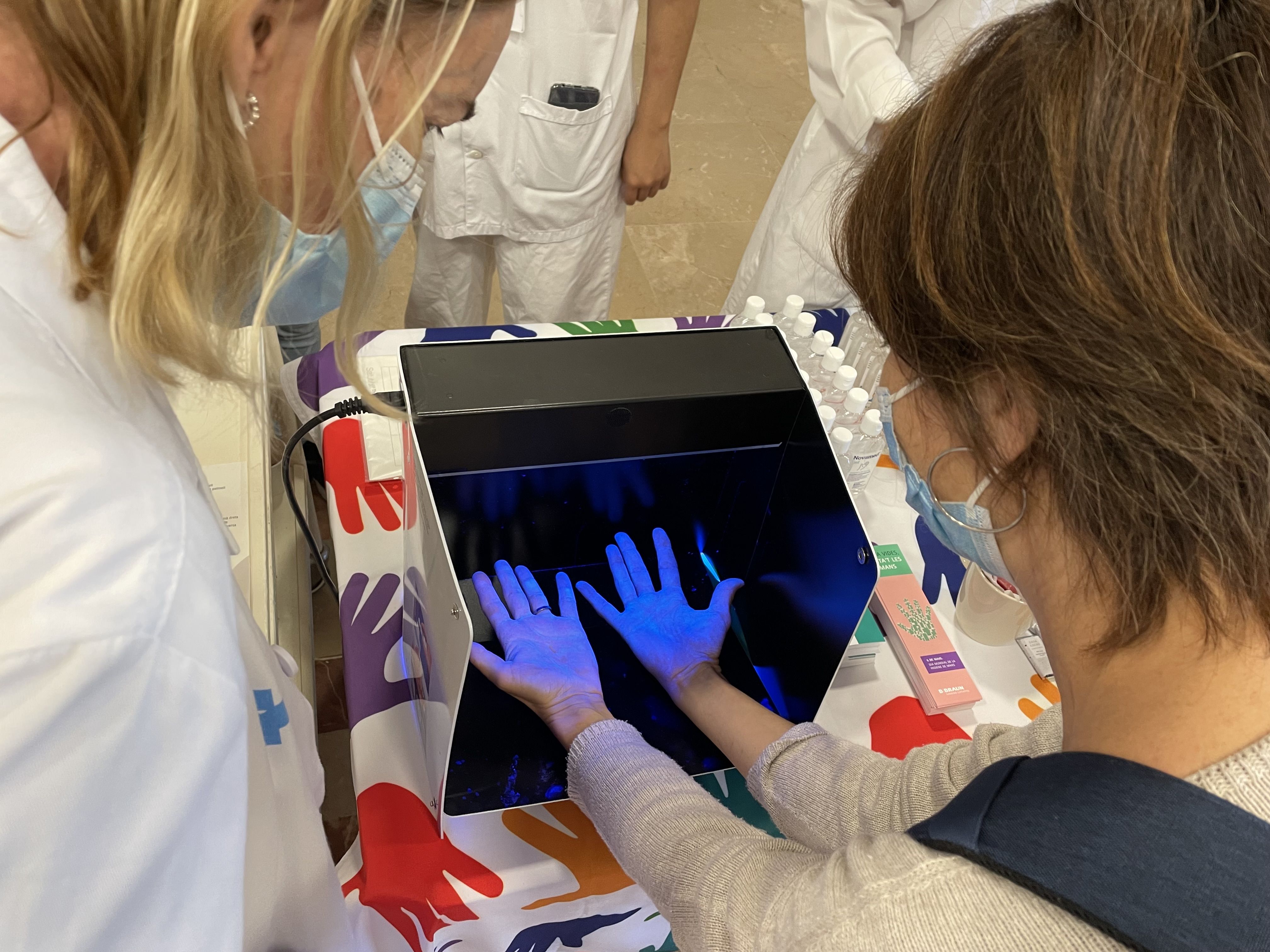 Així, professionals de la Comissió d’Higiene de Mans de l’Hospital Trueta han muntat un punt informatiu al vestíbul del centre, des d’on fan la campanya dirigida a usuaris i acompanyants de pacients, i a professionals. Un cop feta la demostració i formació per part de membres de la Comissió d’Higiene de Mans sobre com fer un correcte rentat de mans, els participants són convidats a fer-ho pel seu compte utilitzant un gel amb contrast. Posteriorment, es comprova si el rentat s’ha fet correctament a través d’uns aparells de llum ultraviolada que permeten detectar les zones obviades durant la tècnica, on poden romandre els gèrmens. Aquestes màquines revelen els racons de les mans que no han estat ben desinfectats, tot i haver practicat una higiene de mans amb solució alcohòlica. Les persones que fan correctament el taller reben com a premi una xocolatina, gentilesa de Casa Cacao, del pastisser Jordi Roca.