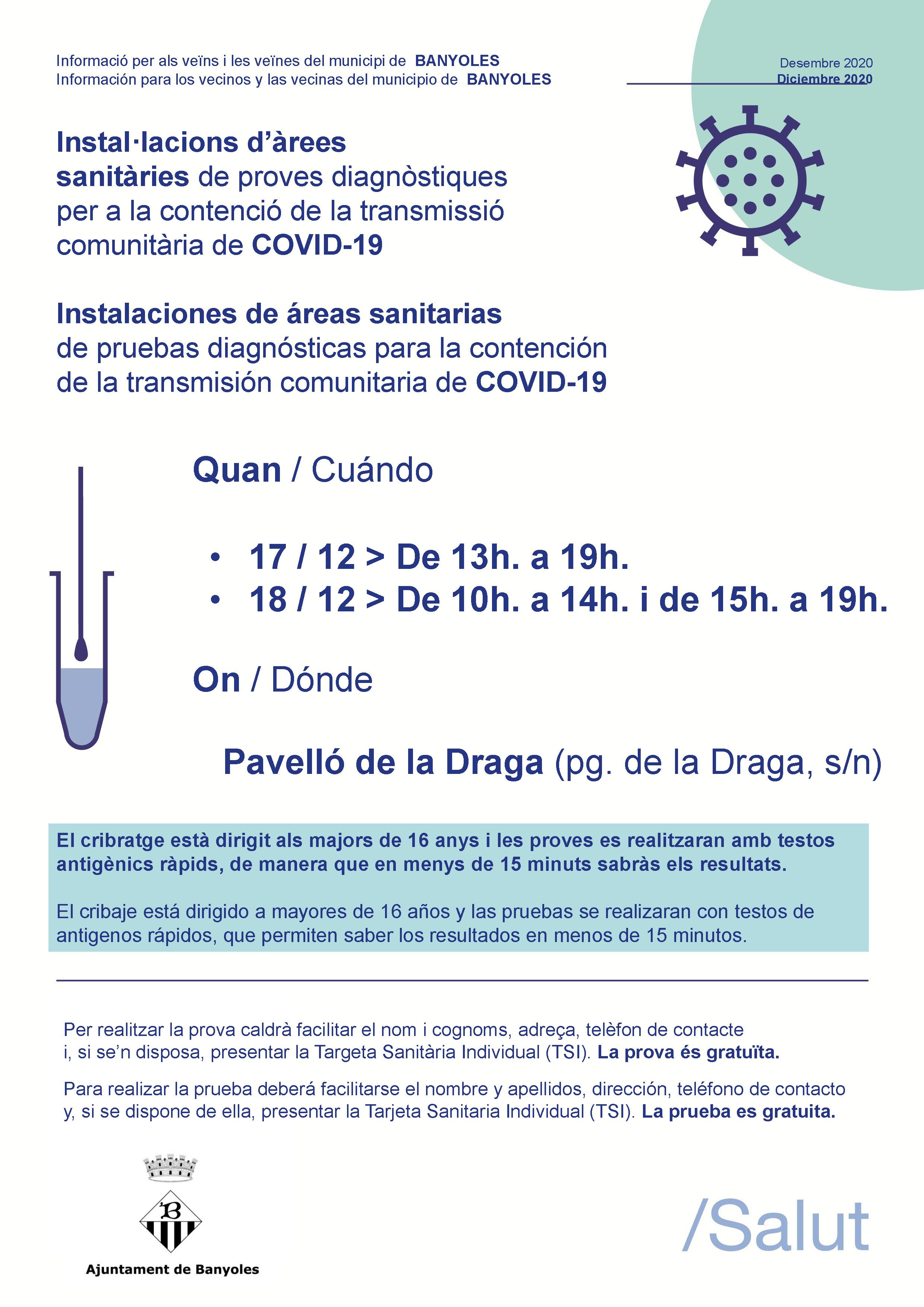 Les proves amb testos antigènics ràpids (TAR) a Banyoles es faran durant dos dies, el 17 i 18 de desembre, en l’horari i espai següents: